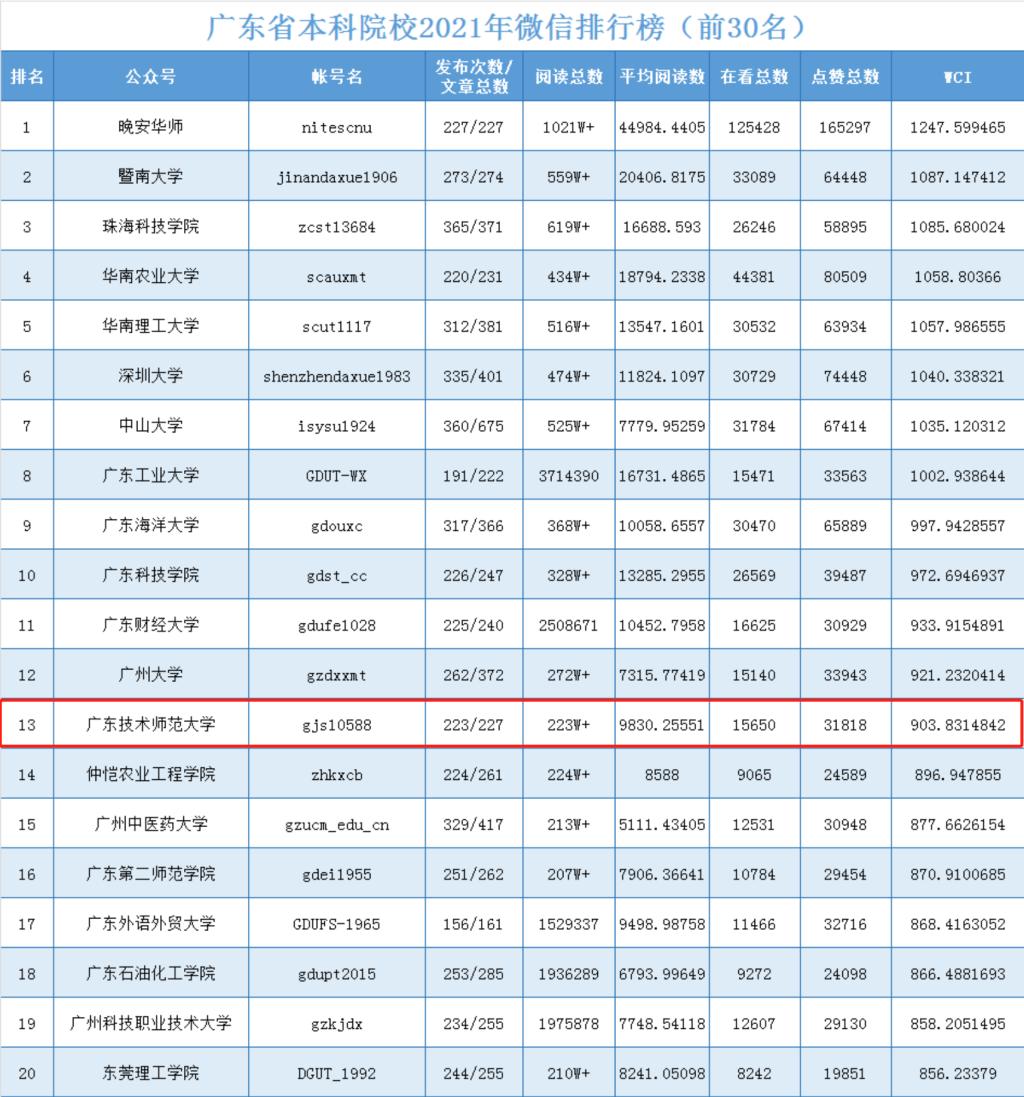 日前,广东高校新媒体联盟发布《2021年度广东高校新媒体影响力前30名名单》,广东技术师范大学官方微信公众号荣获2021年度广东高校(本科院校)新媒体影响力二等奖,在全省本科高校中排位第13名。