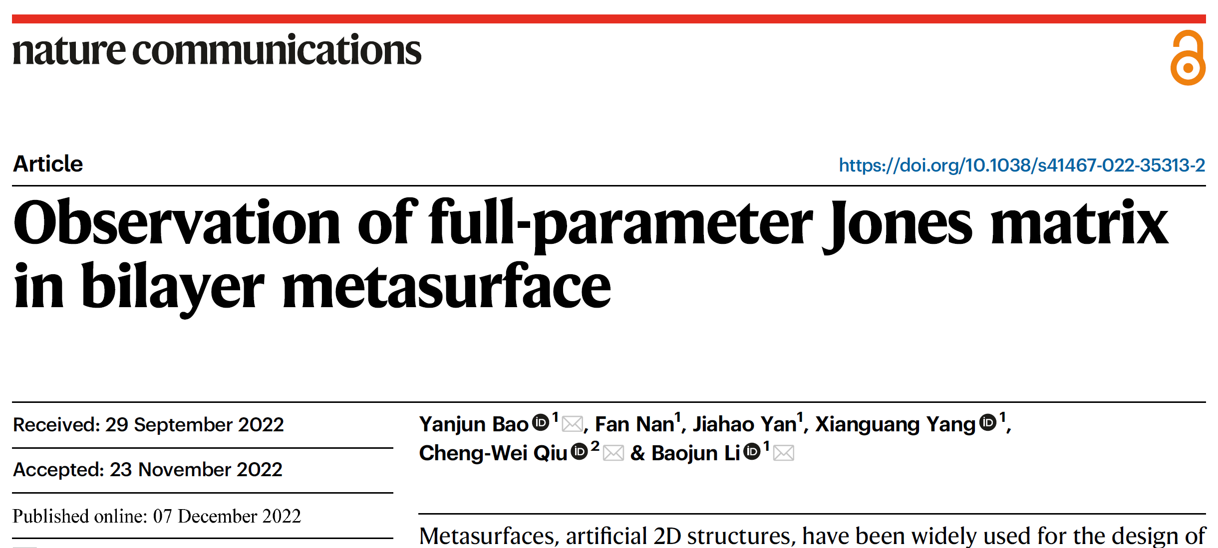 近日,纳米光子学研究院李宝军教授、包燕军教授等在Nature Communications发表自然界最高自由度的超构表面光场调控研究成果。