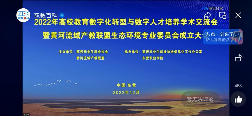12月24日,2022年高校教育数字化转型与数字人才培养学术交流会暨黄河流域产教联盟生态环境专业委员会成立大会以线上线下相结合的方式在东营职业学院成功举办,会议由高校毕业生就业协会主办,高校毕业生就业协会信息化工作办公室、黄河流域产教联盟、东营职业学院承办。高校毕业生就业协会会长、北京语言大学原党委书记王路江、教育部职业教育与成人教育司院校发展处处长任占营、山东省教育厅职业教育处副处长李寿冰、东营职业学院校长李延成等领导出席会议并讲话,13名专家进行了专题报告,线上线下共计2000余人参加了此次会议。