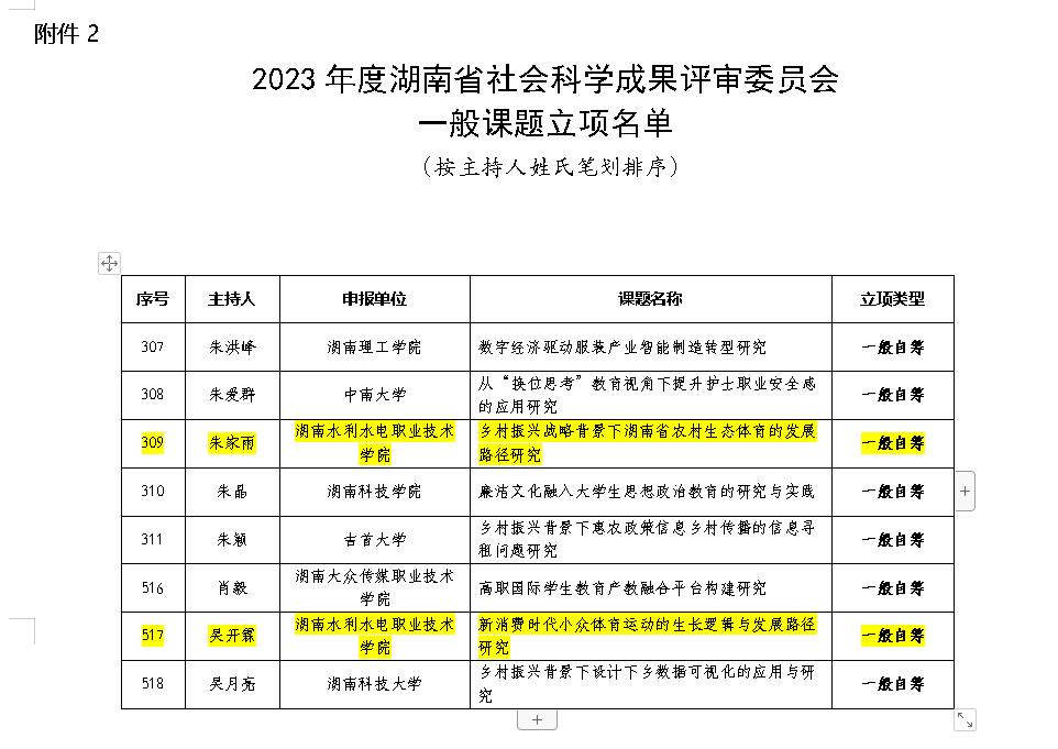 近日,湖南省社会科学界联合会公布了2023年度湖南省社科联研究课题立项名单。经专家评审,基础课部朱家雨老师主持的《乡村振兴战略背景下湖南省农村生态体育的发展路径研究》、吴开霖老师主持的《新消费时代小众体育运动的生长逻辑与发展路径研究》两个研究项目获准立项。