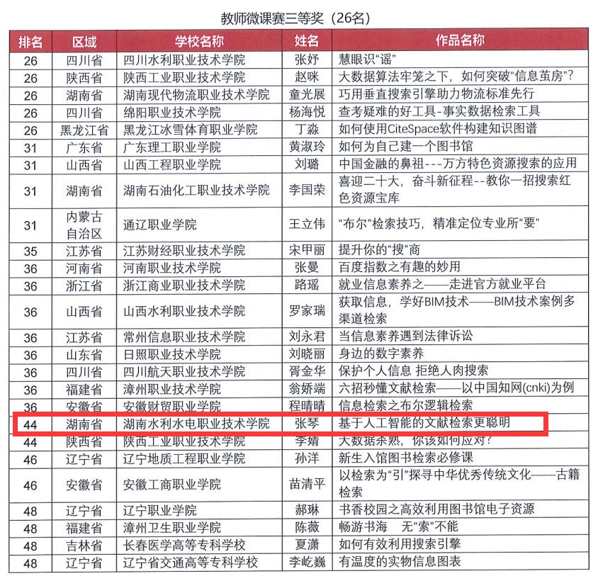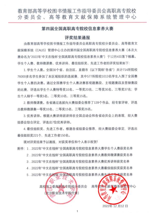 由教育部高等学校图书情报工作指导委员会高职高专院校分委员会、高等教育文献保障系统(CALIS)管理中心主办的第四届全国高职高专院校信息素养大赛于12月13日揭晓评奖结果。我校师生在大赛中获佳绩。