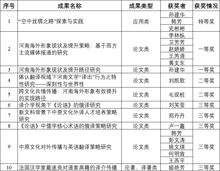 近日,中共河南省委外事工作委员会办公室印发《关于2022年度“翻译河南”工程优秀成果征集情况的通报》(豫外委办〔2023〕6号),河南财经政法大学荣获特等奖1项、一等奖2项、二等奖2项、三等奖5项。这是学校在该项评选活动中首次获得特等奖,此次获奖也是学校外语学院参与“翻译河南”工程成果的一次集中展示。