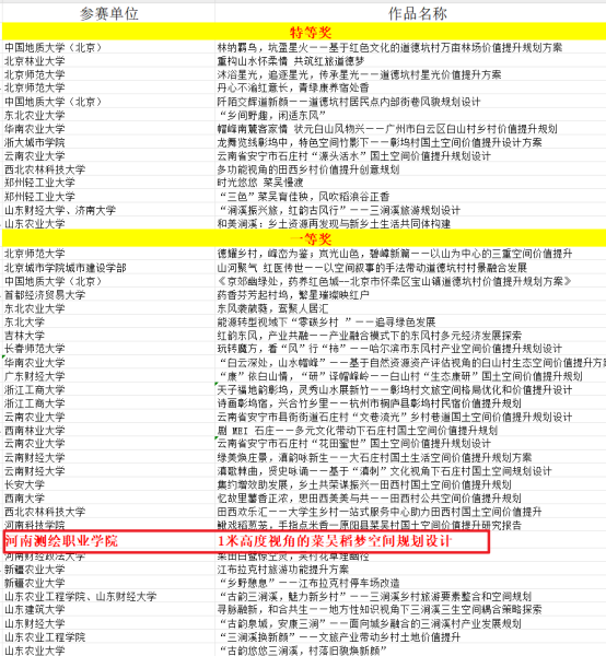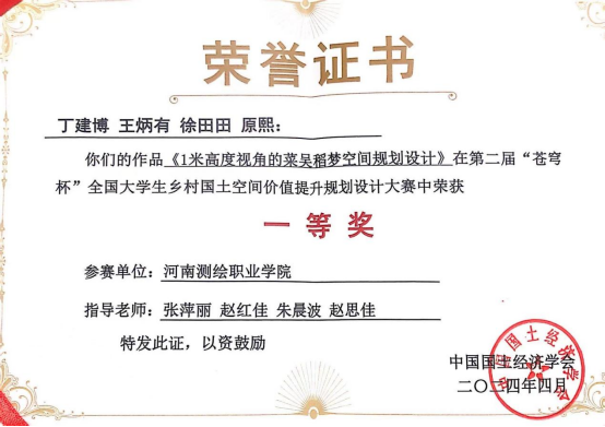 第二届“苍穹杯”全国大学生乡村国土空间价值提升规划设计大赛全国总决赛于2024年04月20日在中国地质大学(北京)举办,河南测绘职业学院代表队是唯一一支进入到决赛的高职院校队伍。经过激烈的角逐,参赛作品“1m高度视角的菜吴稻梦空间规划设计”作品荣获一等奖。