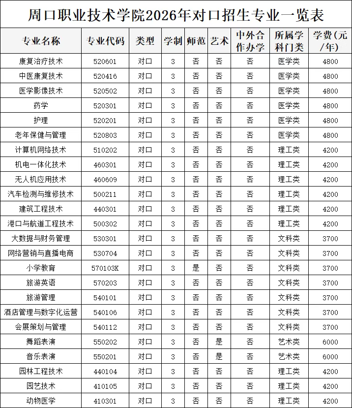 周口职业技术学院2026年对口招生章程