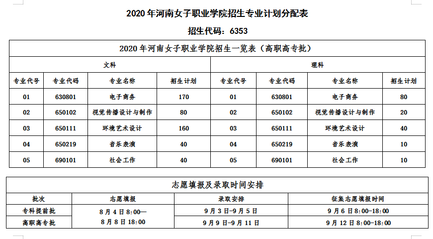 我院2020年招生专业计划分配表